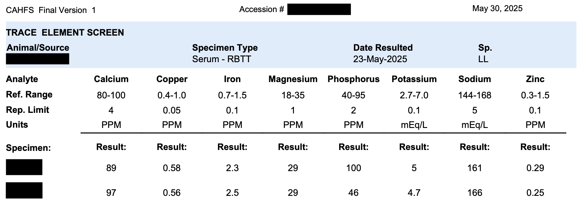 Severe trace mineral deficiencies are rare in the US today, but we often see marginal trace mineral deficiencies, which have more subtle clinical signs. If you are seeing poor hair coat, weight loss, poor performance, or poor reproductive performance in your animals, you may want to consider testing your trace mineral levels. Consult with your veterinarian further if you are concerned your animals may be deficient in trace minerals.